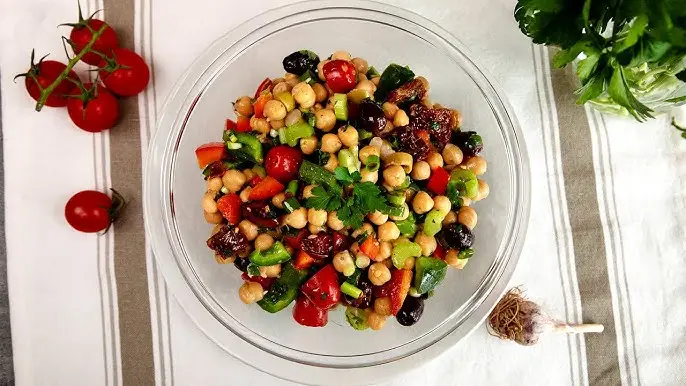 Pentru această salată vei avea nevoie de năut fiert (poți folosi conservă pentru simplitate sau îl fierbi tu acasă), roșii proaspete, castraveți, ardei gras, ceapă roșie și verdeață – pătrunjel și mărar proaspăt tocate. Secretul constă în dressingul simplu dar aromat: ulei de măsline, zeamă de lămâie, sare, piper și o lingurița de muștar (verifică eticheta să fie de post).